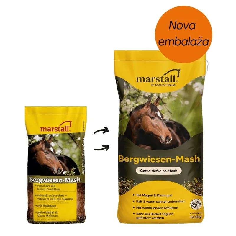 Marstall Bergwiesen-Mash je alternativa tradicionalnim kašama, ali bez žitarica i s niskim udjelom šećera. Njegov iznimno lako probavljiv recept je prijateljski prema crijevima, pospješuje probavu i potiče apetit. Bez žitarica je, melase ili umjetnih šećera, mekinja ili aroma te bez dodanih vitamina i minerala.