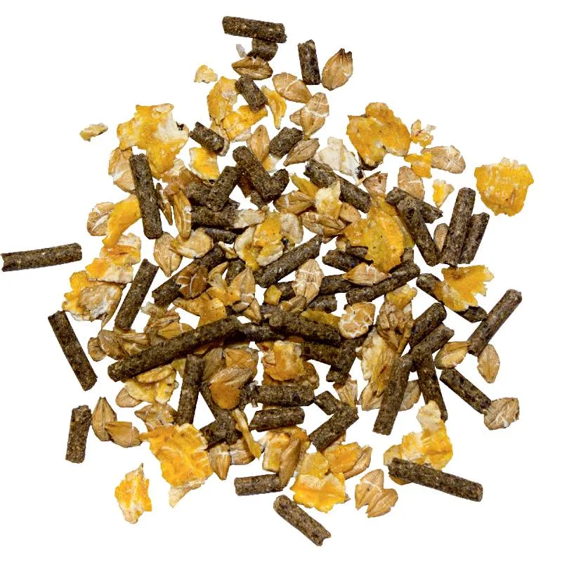 Ječmene pahuljice (30,00 %), kukuruzne pahuljice (20,00 %), trava, sušena pri visokoj temperaturi (15,00 %), posije (14,50 %), sušena repina pulpa melasirana (14,50 %), repina melasa (3,50 %), karbonat (1,60 %), natrijev klorid (0,35 %).