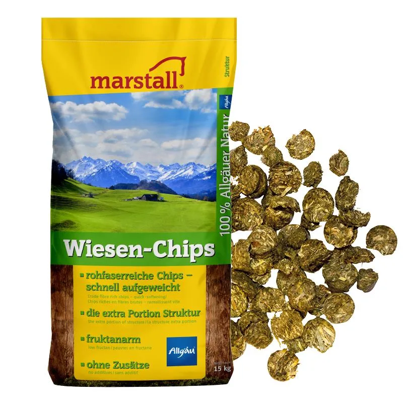 Marstall Wiesen-Chips je brza alternativa Marstall Wiesen-Cobsom. Marstall Wiesen-Chips je napravljen od dokazano raznolikih prirodnih travnjaka Allgäua. Kasna košnja i nježna obrada osiguravaju visoku razinu sirovih vlakana u kombinaciji s niskim udjelom bjelančevina i fruktana.