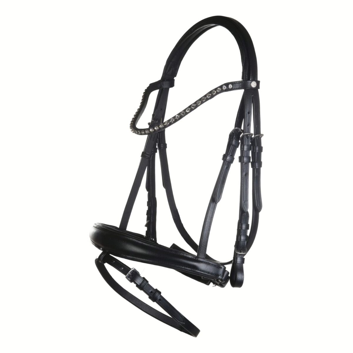 Uzda HKM Bella je kožna i ima podloženu njušku i potiljni dio. Njuška se kopča na “pull-back” način. Metalni dijelovi su u srebrnoj boji. Vodilice su priložene.