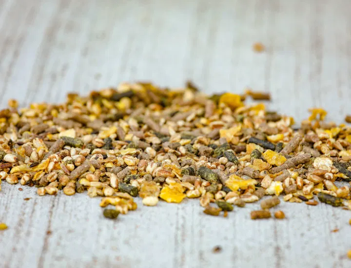 Sestava: pšenični otrobi, ječmenovi kosmiči, lucerna, oves, koruzni kosmiči, lanene luščine, koruzni otrobi, pražena sojina zrna, laneno seme, melasa iz sladkornega trsa, sončnična krmna surovina, pira, sojino olje, ekspandirana koruza, ekspandiran ječmen, ekspandirana pšenica, sušena cikorijina pulpa, koruza, sojina krma, sojine luščine, pirini otrobi, pšenica, natrijev klorid, kalcijev karbonat, koruzna glutenska krma, frukto-oligosaharidi, pšenična glutenska krma, koruzni gluten, magnezijev oksid.