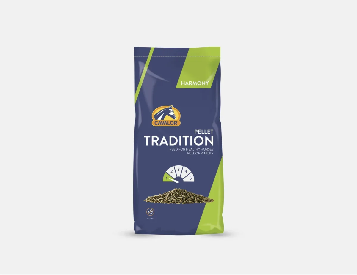Cavalor Tradition Pellet je peletirana osnovna krma (level 1) za konje v rekreativnem do lahkem treningu ali za občutljive konje, ki ne potrebujejo “hitre” energije iz ovsa. Formula je brez ovsa, zasnovana kot praktična, okusna in uravnotežena dnevna podpora ob dobri voluminozni krmi.