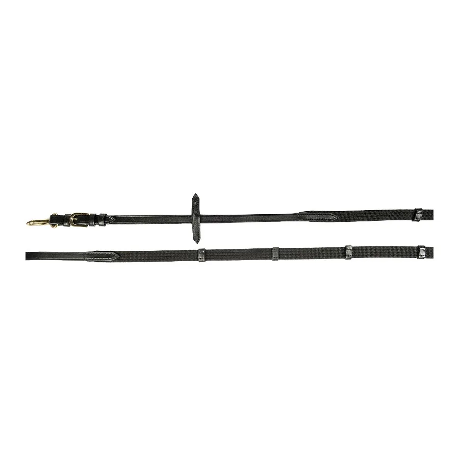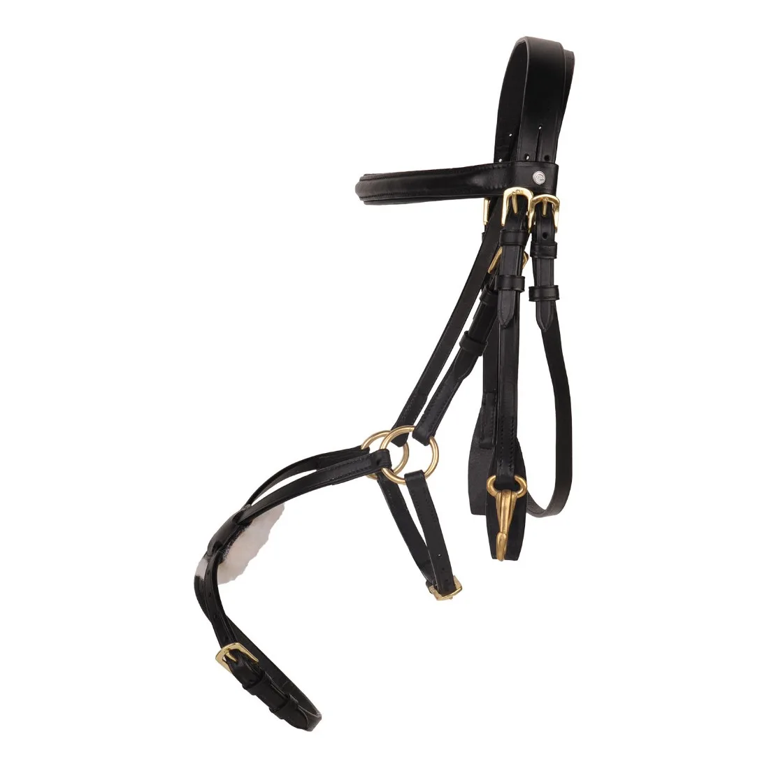 HKM pony uzda z mehiškim nosnikom in priloženimi tkanimi vajetmi. Uzda za ponija ima medeninaste zaponke in karabine, za hitro snemanje brzde in vajeti.
