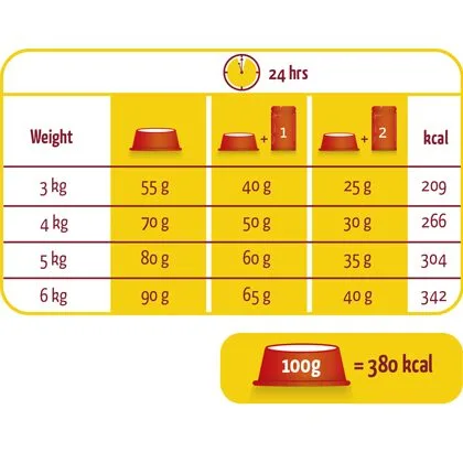 Sestava: žitarice, meso in živalski derivati (piščanec 25%), izvlečki rastlinskih beljakovin, olja in maščobe, derivati rastlinskega izvora, zelenjava, kvas, minerali.
