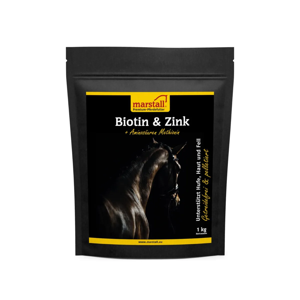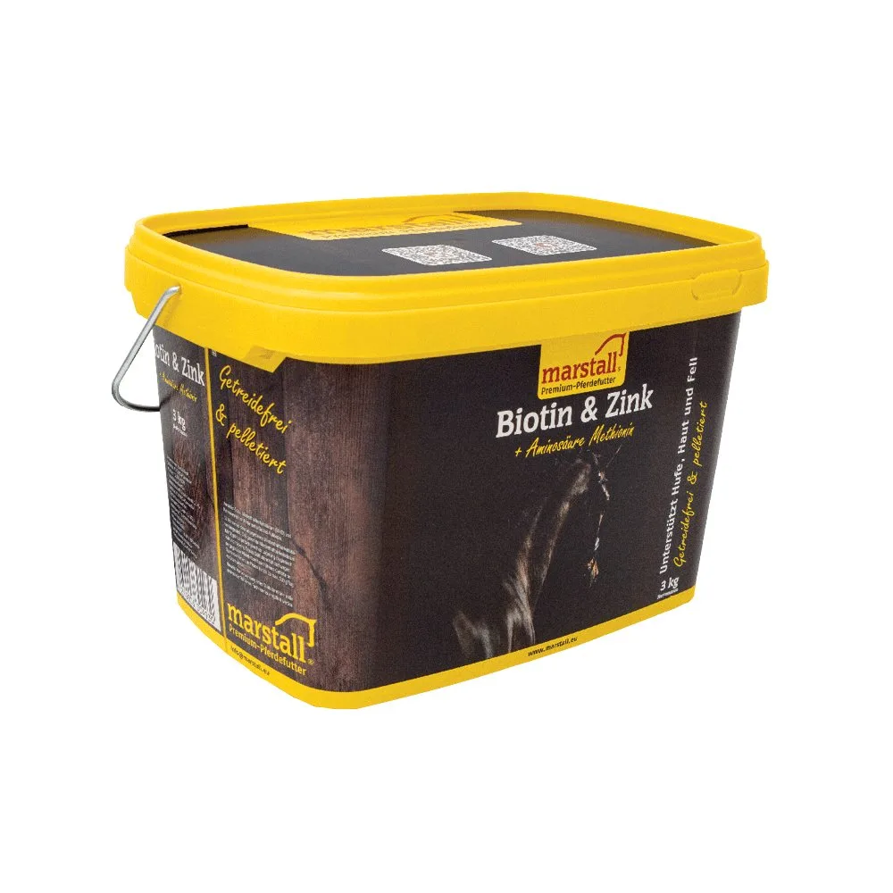 Z organskim cinkom – spodbuja zdravje kopit, kože in dlake, brez žit, peletirano dietetično dopolnilno krmilo marstall Biotin & Cink je dopolnilno krmilo brez žit, ki dolgoročno izboljšuje stanje kopit, kože in dlake. Biotin, cink in aminokislina metionin prispevajo k elastičnosti roževine in povečujejo njeno trdnost. Na ta način lahko tudi breje in doječe kobile ter žrebeta dosežejo ustrezno raven cinka, biotina in metionina. Mnogi konji imajo slabo kakovost roževine – kopita postanejo mehka, lepljiva, razpokana ali celo razcepljena. Takšni konji pogosto trpijo tudi za dolgočasnoin pusto dlako, vnetji lasnih mešičkov, pretiranim izpadanjem dlake ali težavami s kožo. Če so pogoji oskrbe ustrezni, so tovrstne težave pogosto posledica pomanjkanja biotina, cinka ali aminokislin v krmi – še posebej, če trajajo dlje časa. Pomanjkanje biotina lahko povzroči tudi porušena črevesna flora. Marstall Biotin & Cink pomaga ponovno napolniti zaloge teh hranil.