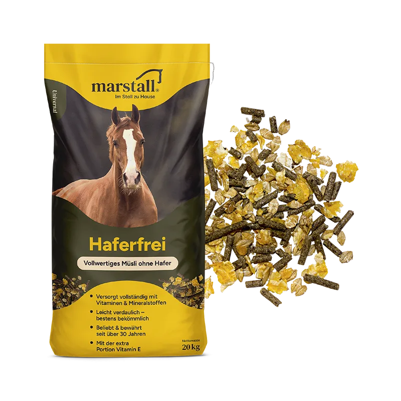 Marstall Haferfrei je najboljša krma za vsakega konja v vseh okoliščinah. Njegov recept se je nenehno razvijal več kot 25 let. Daje najboljše rezultate pri konjih z zmernim temperamentom. Marstall Haferfrei lahko individualno in ekonomično kombinirate z vašo izbiro žit. Sestavljen je iz lahko prebavljivih, hidrotermalno maceriranih žitnih kosmičev in posebnih, koncentriranih hranilnih peletov. Zaradi visoke vsebnosti vitaminov, mineralov in elementov v sledovih lahko zmanjšate količino koncentratov, kar vam prihrani denar in je prijaznejše za konjski želodec.