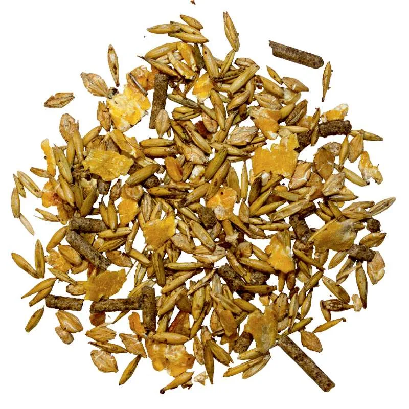 Oves (40 %), ječmenovi kosmiči (25 %), koruzni kosmiči (17 %), melasa iz sladkorne pese (4 %), otrobi iz zdroba (3,9 %), melasirani tropi sladkorne pese (2,3 %), pšenični otrobi (2,3 %), suhi grozdni trop (1,3 %), kalcijev karbonat (0,9 %), natrijev klorid (0,3 %), monokalcijev fosfat (0,25 %), pivski kvas (0,25 %), magnezijev oksid (0,1 %).