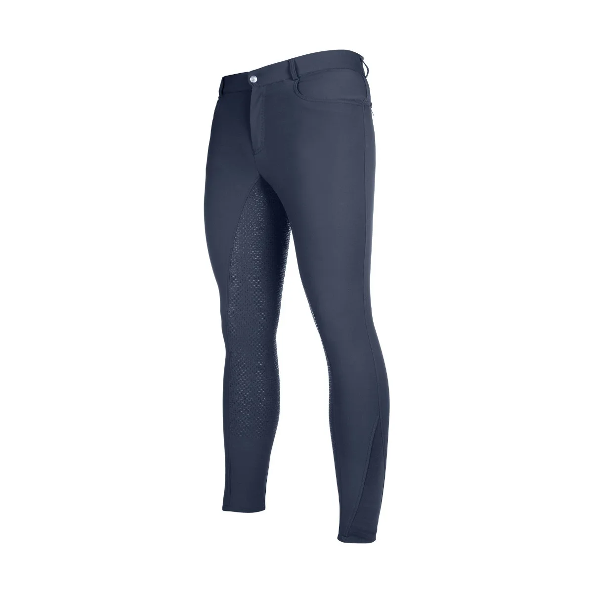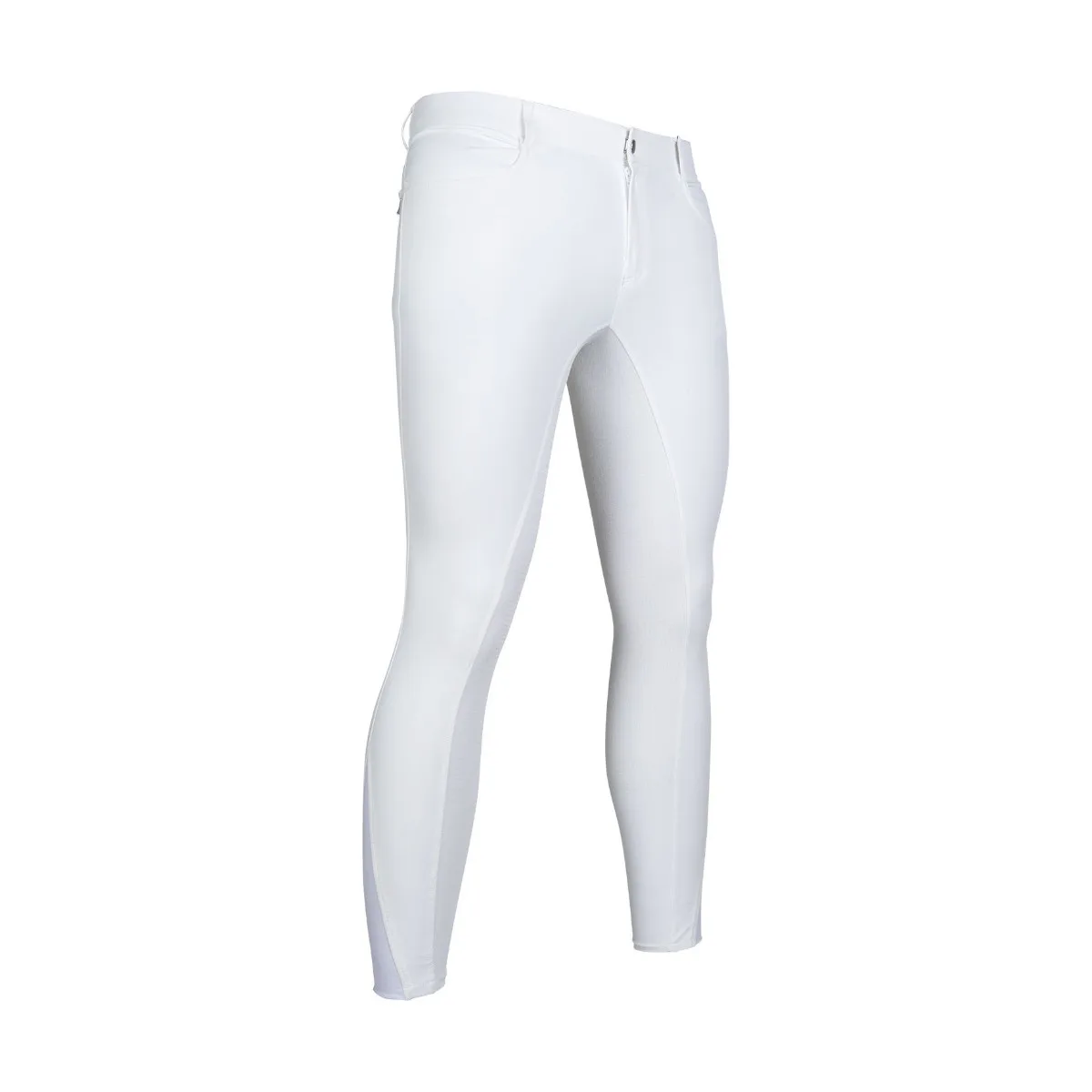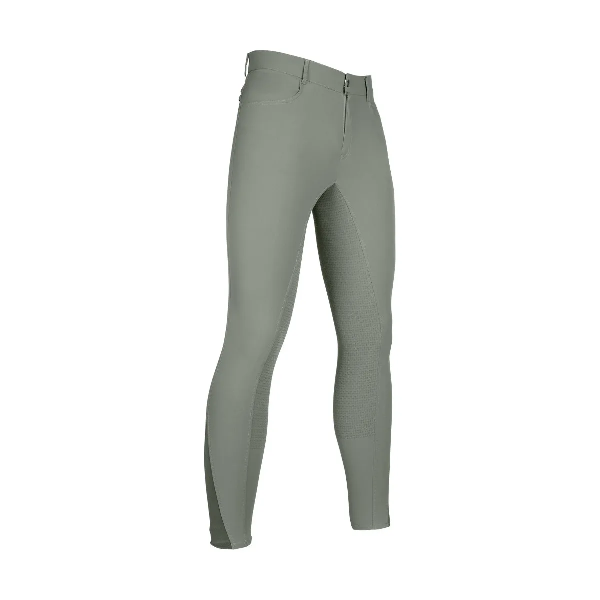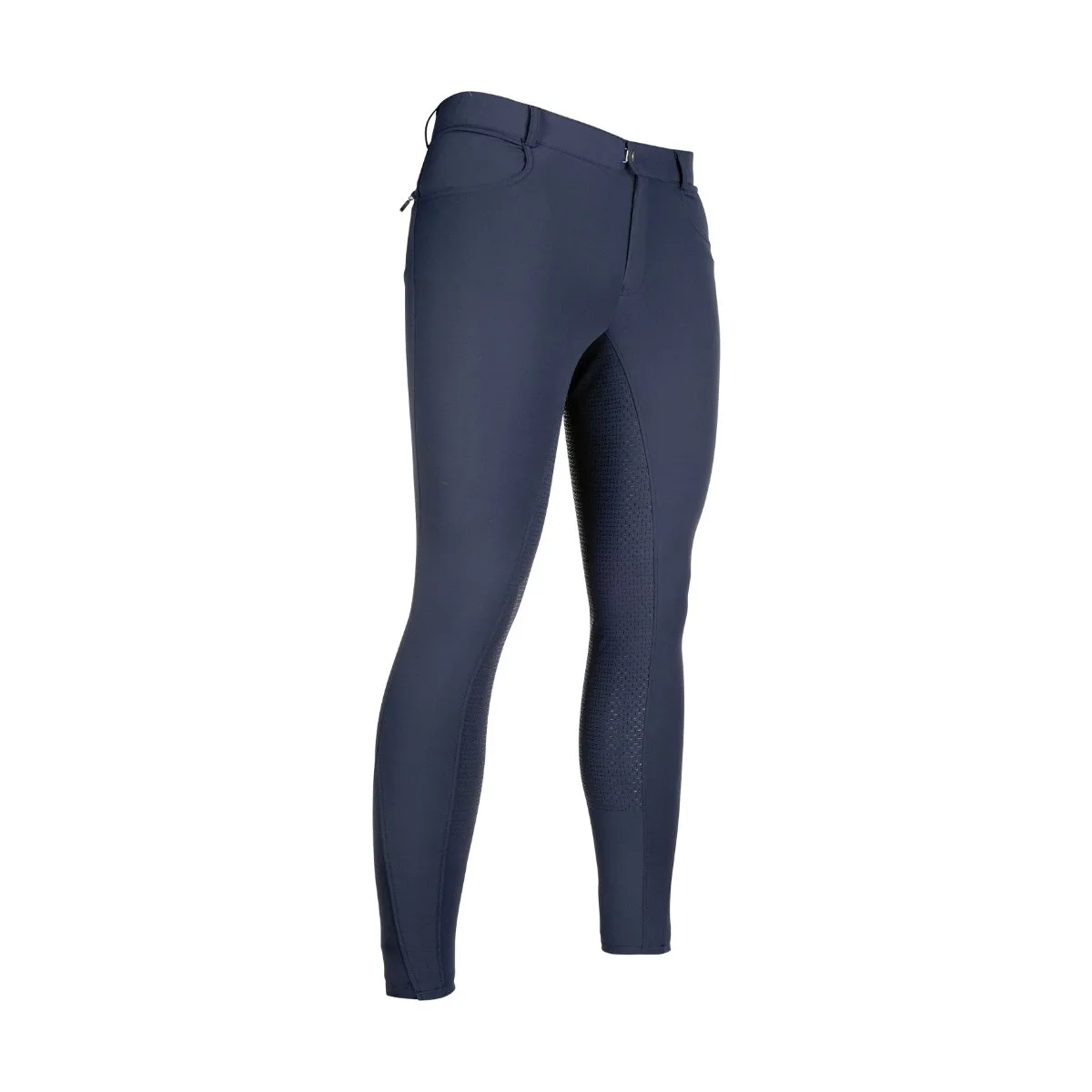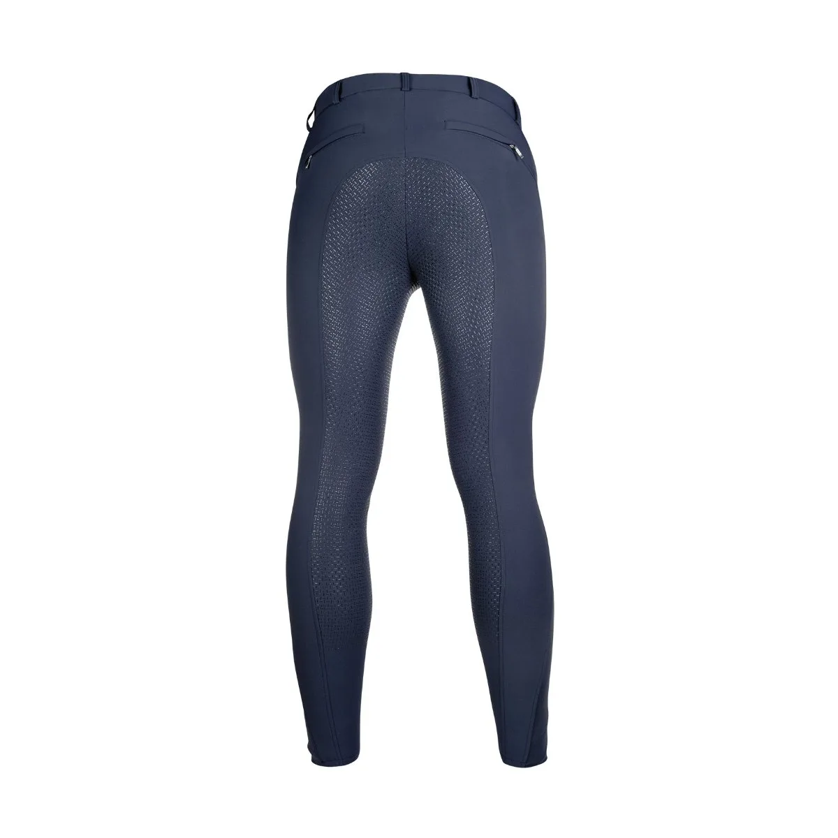 Moške jahalne hlače HKM Sportive z udobnim elastičnim vstavkom na predelu gleženja za lažje oblačenje. Moške jahalne hlače imajo 2 zadnja žepa z zadrgo in 2 sprednja žepa. Sedišče je v celoti iz silikona, kar zagotavlja dober oprijem v sedlu.