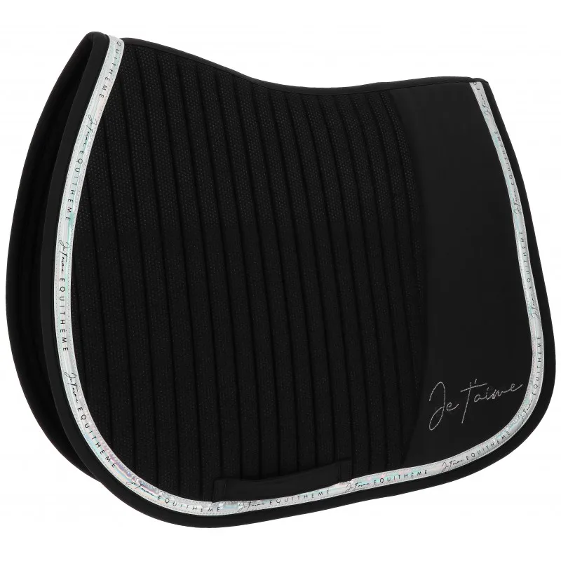 Je T’aime Talent je podsedelnica za tiste, ki v parkur vstopijo z jasnim stilskim stališčem. Prešivanje je izvirno in subtilno — ne klasični kvadratki, ampak premišljen vzorec, ki daje površini karakter brez kiča. Ob robu teče srebrna ploščata vezenina z mirror efektom, ki ujame svetlobo pri vsakem koraku konja. Podpis JE T’AIME je zadnji detajl, ki loči podsedelnico od povprečja.