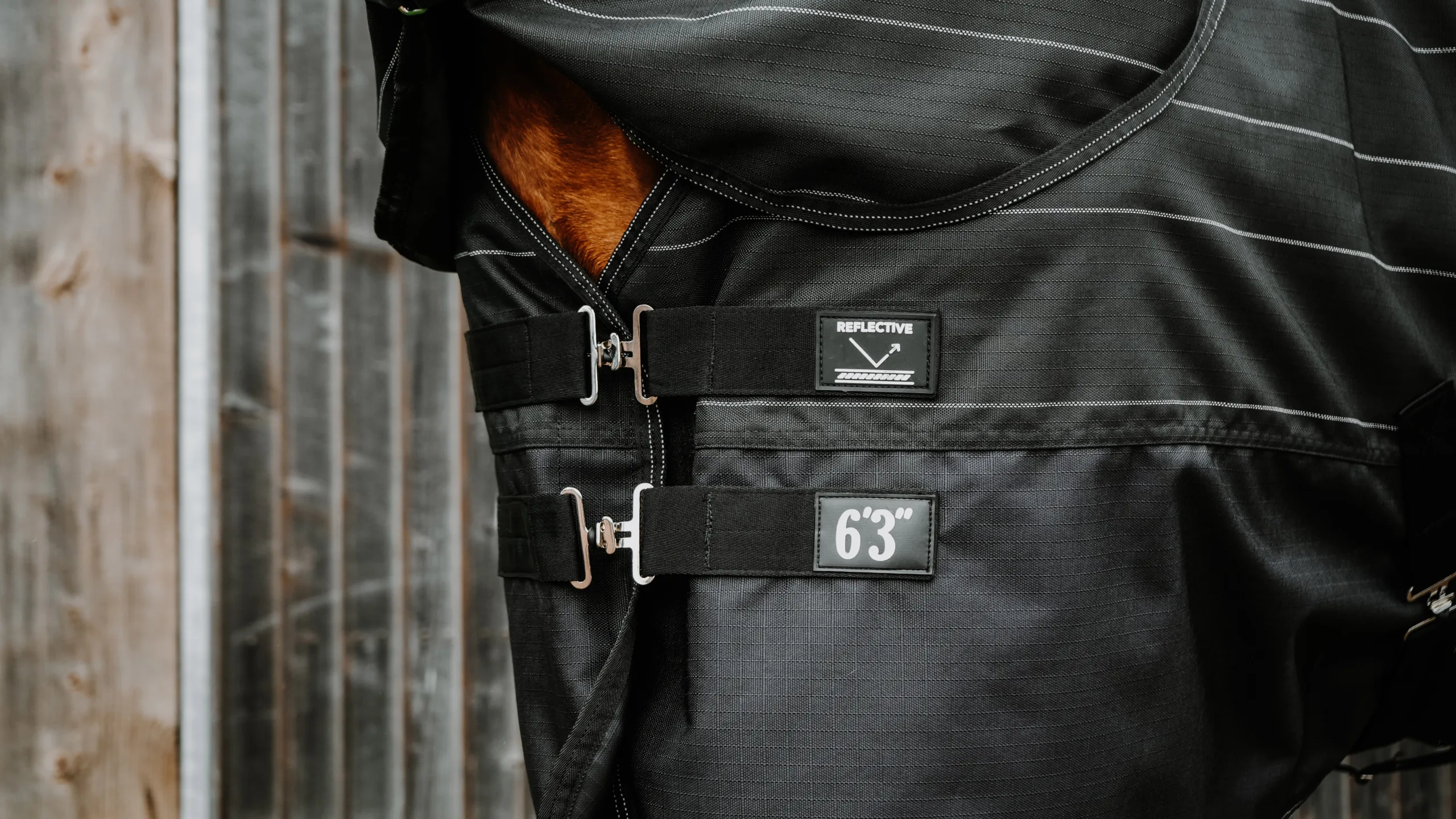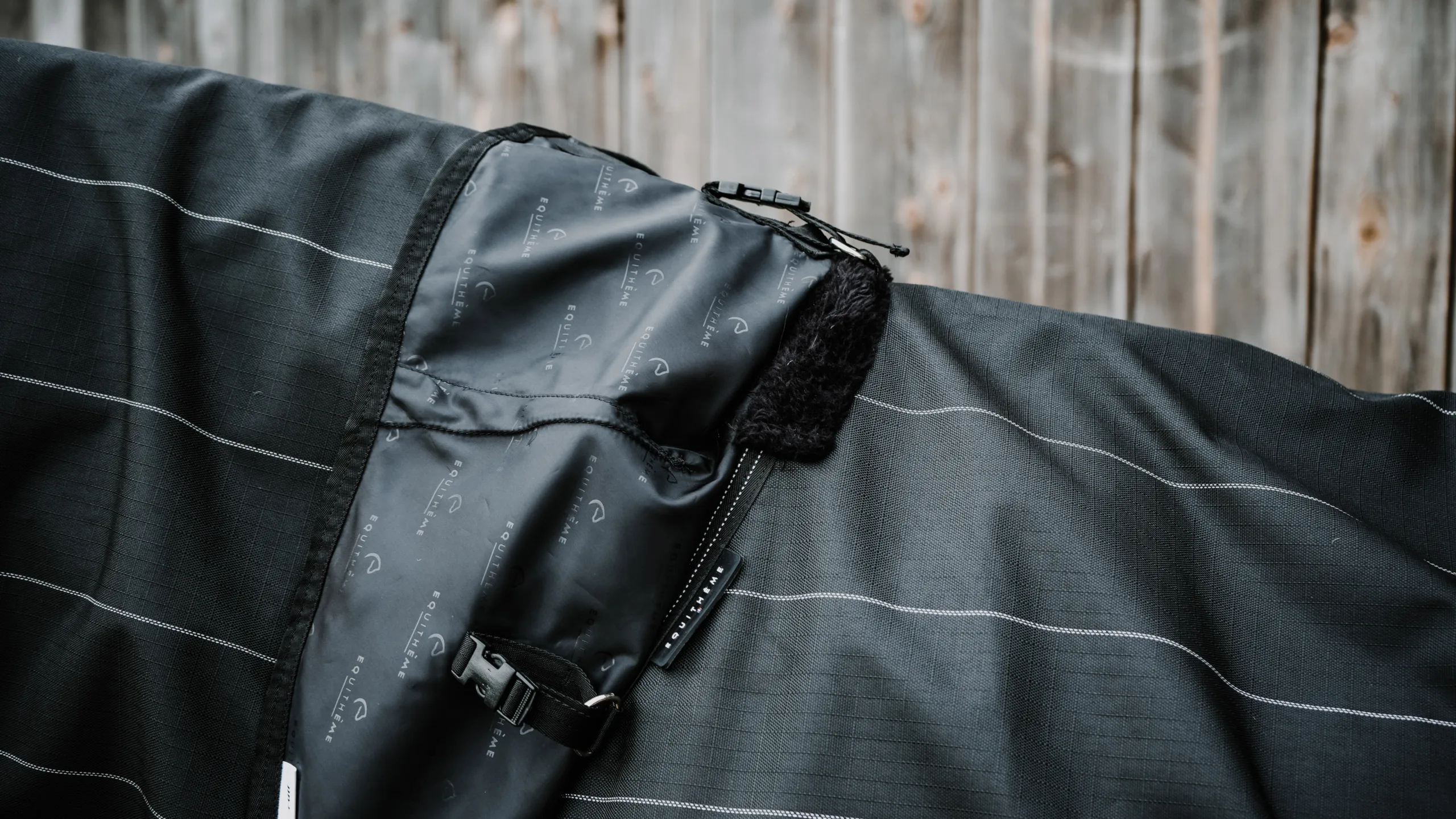 Za dobro prileganje ima odeja nastavljivo sprednje zapenjanje, križne pasove ter nastavljiv repni pašček, dodatno pa 3 pritrdilne obročke za vratni del (neck cover) in najlonsko zaščito pri ramenih, ki pomaga preprečevati odrgnine. Spredaj je zaključena z gumirano zaponkoter odsevnim EQUITHÈME logotipom.