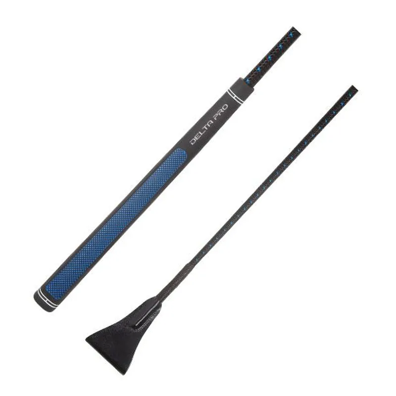 Skakalni bič za konje Fleck Delta Pro – profesionalni jahalni bič z jedrom iz steklenih vlaken, prekritim s pletenim najlonom. Tanek, ergonomski nedrseč ročaj v obliki trikotnika z odličnim oprijemom. Širok zaprt zavihek iz govejega usnja na koncu.