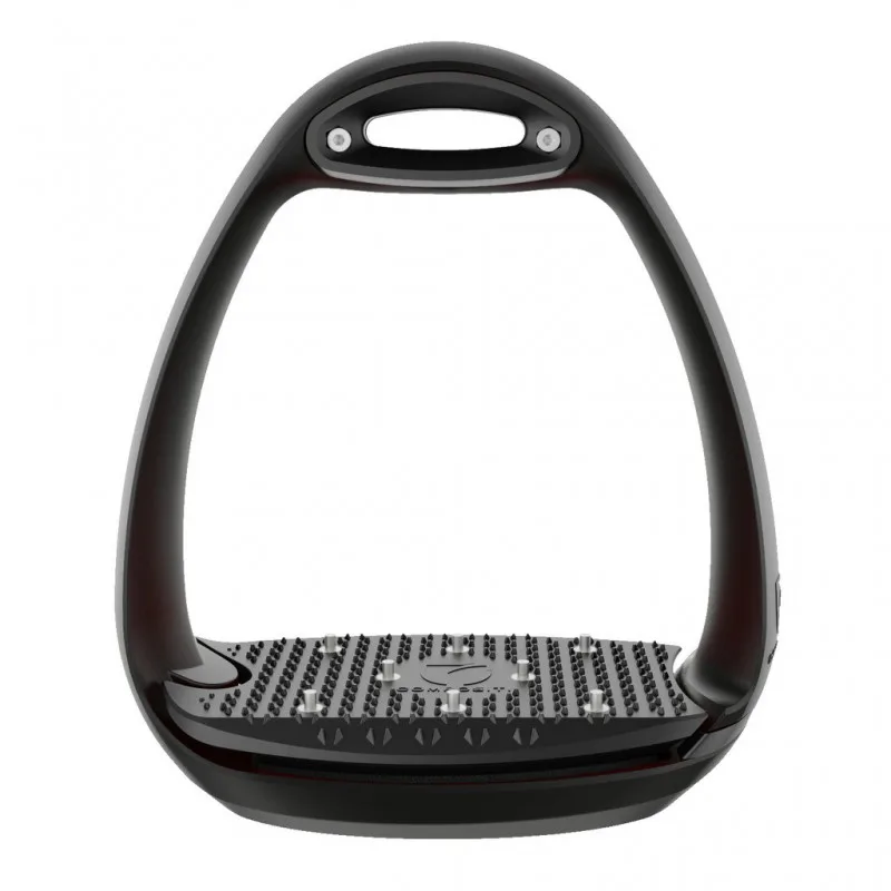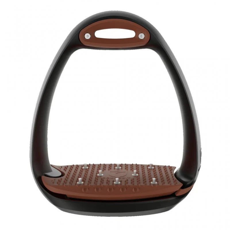 Stremena Compositi Eole Pro – streme oblikovano z amortizerjem. S svojimi elegantnimi linijami streme “Eole Pro”, zagotovi maksimalno udobje in učinkovitost. Široka površina, pritrjena na plast za blaženje udarcev, se nagne nazaj, da sledi naravnemu gibanju stopala. Ta edinstven sistem sprosti napetost v kolenih in sklepih. Kovinske konice iz nerjavečega jekla zagotavljajo okrepljen oprijem v vsakem trenutku. Zamenljiva očesca, kjer teče stremenica, omogočajo izbiro med klasičnim ali pravokotnim položajem stremena.