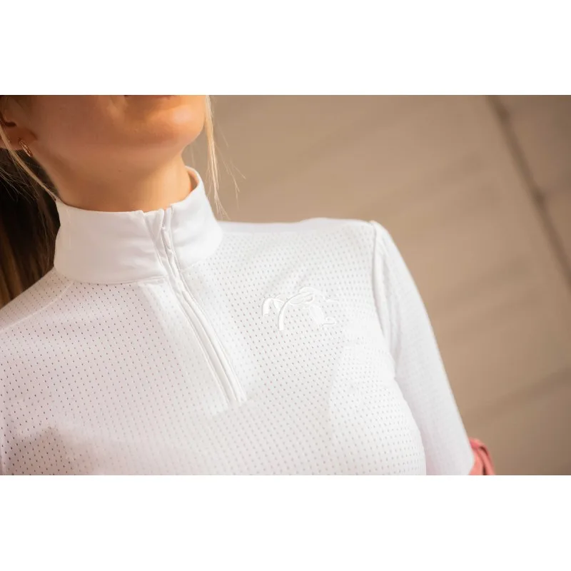 Tekmovalna polo majica Pénélope Bruges Mesh z dolgimi rokavi je zasnovana za jahačice, ki pod tekmovalnim suknjičem ne želijo kompromisov — ne glede videza, ne glede udobja. Mikro-perforirana tkanina deluje kot mreža za zrak: minimalna teža, maksimalna prezračenost, brez občutka stisnjenosti.