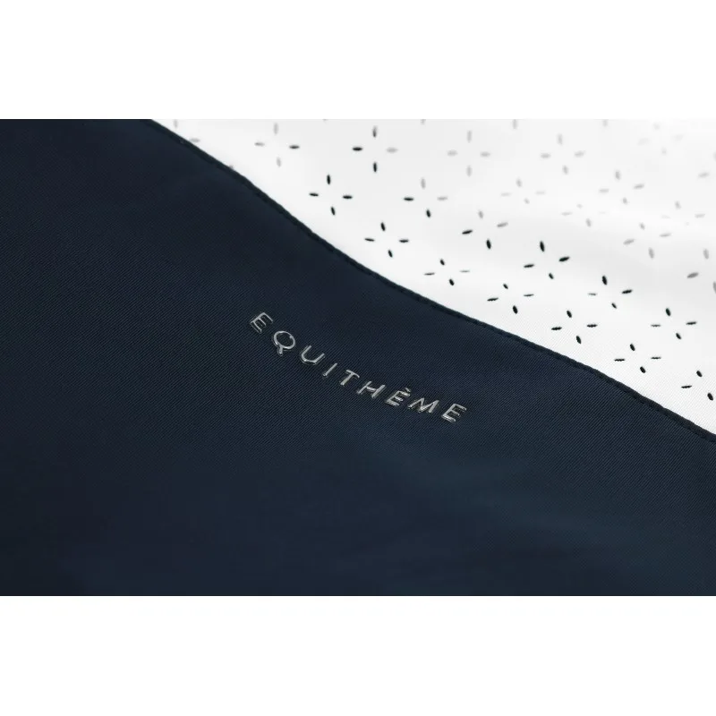 Majica je izdelana iz visoko elastičnega in hitrosušečega materiala, ki sledi gibom telesa in odvaja vlago stran od kože — tako ostanete suhi in sproščeni tudi pri visoki intenzivnosti. Na ramenih, robovih rokavov in ob straneh so kontrastne tkanine z lasersko izrezanim vzorcem, ki majici dajejo sofisticiran, tehnični videz. Plastron je okrašen z rhinestone-efekt trakom, ki doda rahel glamur. Na hrbtu je diskretno izvezen logotip EQUITHÈME.