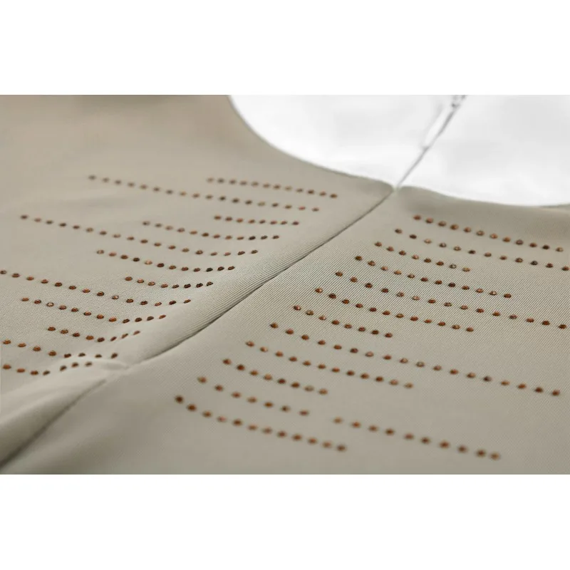 Tkanina iz 80% poliamida in 20% elastana (150 g) je raztegljiva, lahka in hitro se suši, kar zagotavlja svobodo gibanja in svežino skozi celoten tekmovalni dan. UV zaščita 50+ poskrbi za dodatno varnost pred soncem pri jahanju na prostem.