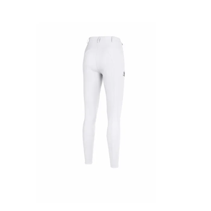 PIKEUR VALLY GR bele – ženske tekmovalne jahalne hlače s polnim silikonskim oprijemom, iz zelo elastičnega in zračnega Tech-Jersey materiala. Srednje visok pas lepo objame. Gost material pa je primeren za tekmovanja, saj ni prosojen in lepo drži obliko. Elegantnejši videz dopolnjujejo diskretni bleščeči detajli iz kamenčkov ter dinamični stranski pasovi z vgrajenim žepom za telefon, spredaj pa je še majhen všit zadržni žep.