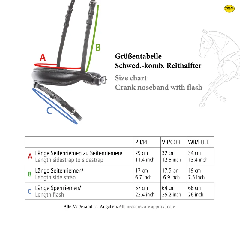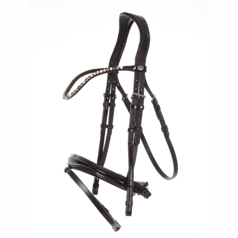 Kavalkade Reyna KavalSH4 je elegantna uzda iz lakiranega usnja, zasnovana za natančno prileganje in čist tekmovalni videz. Ima švedsko kombiniran nosnik, ki je nastavljiv na obeh straneh, anatomsko oblikovan naglavni del ter poševno nameščen podvratni jermen za bolj miren položaj uzde.