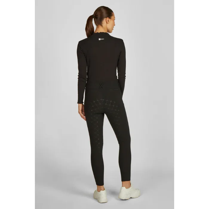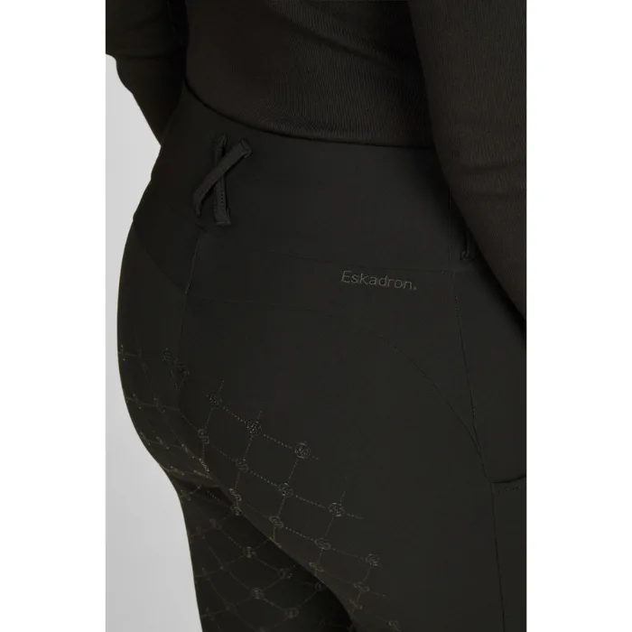 Silikonski full grip potisk na sedišču poskrbi za varen oprijem, medtem ko elastičen pas zagotavlja udobno prileganje. Elegantna črna barva se zlahka kombinira z vsako zimsko jahalno garderobo, subtilni Eskadron detajli pa dodajo pridih prestiža.